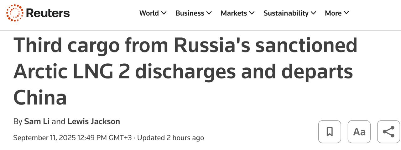 Как сообщает Reuters, Китай уже получил третью партию российского СПГ, находящегося под санкциями, с завода «Арктик СПГ-2».