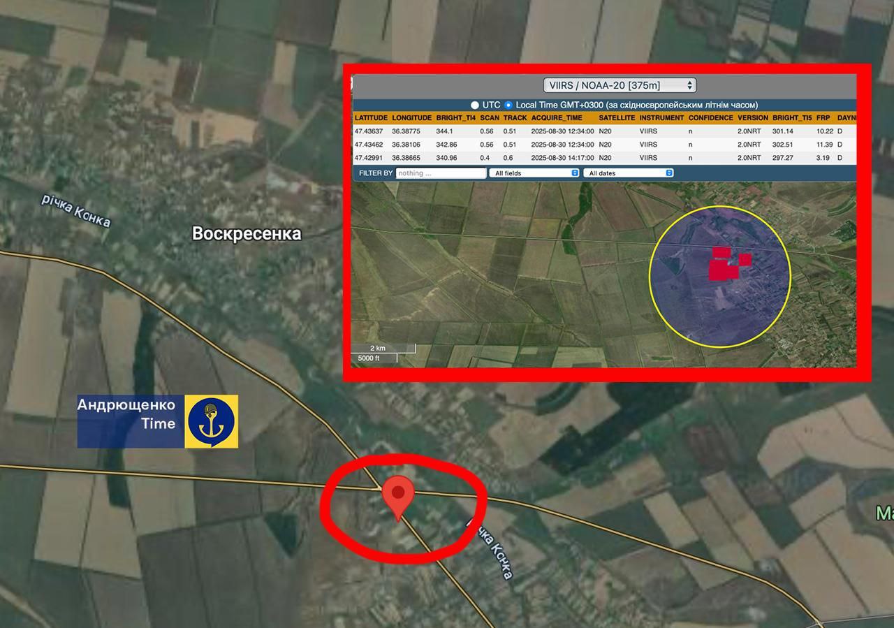 Точные координаты атаки — 47.43636, 36.38773, отметил Андрющенко. Также добавляется скриншот карты пожаров FIRMS NASA, на которой красным указано место возгорания.