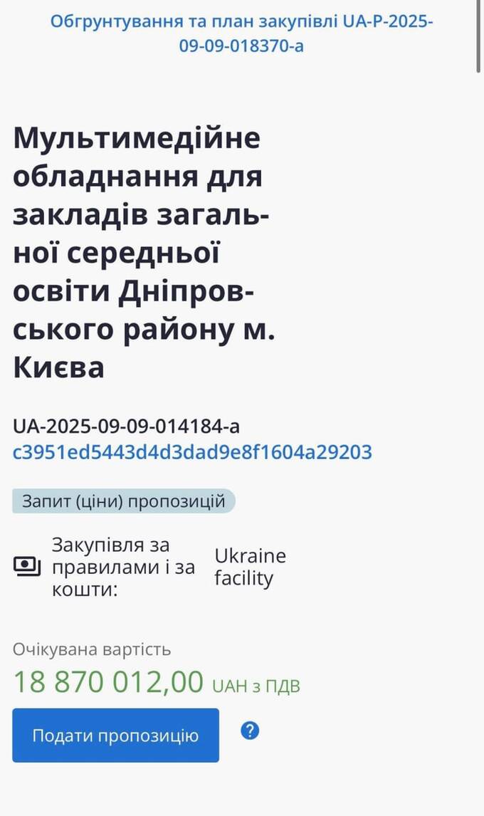 Сфера закупок в столичном образовании продолжает привлекать внимание общественности из-за непрозрачных условий тендеров. На этот раз речь идет о новом тендере Днепровского управления образования на мультимедийную технику для школ на сумму 18,8 млн. грн.