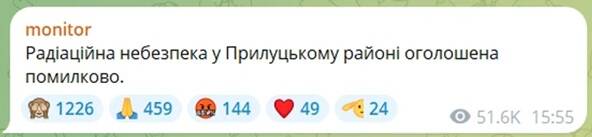 "Радиационная опасность в Прилукском районе объявлена по ошибке", — сообщили на мониторинговых каналах.