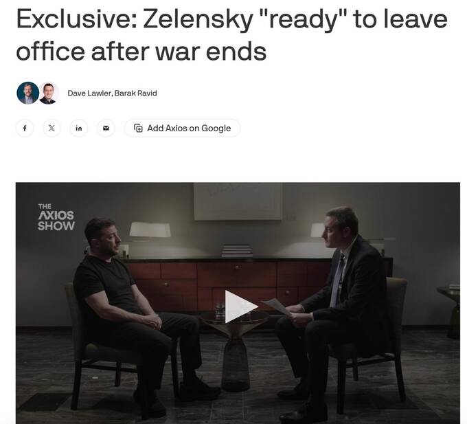 «На вопрос, будет ли он считать свою миссию выполненной после завершения войны, Зеленский ответил, что будет «готов» сложить полномочия. «Моя цель — завершить войну», а не продолжать политическую карьеру, подчеркнул он», - пишет издание.