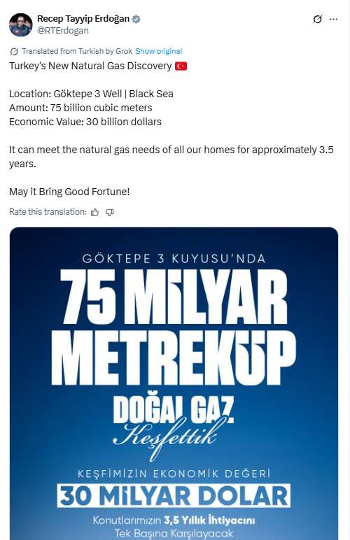 По словам президента Турции Реджепа Тайипа Эрдогана, этого хватит, чтобы удовлетворить потребности всех домохозяйств в стране в течение 3,5 лет.