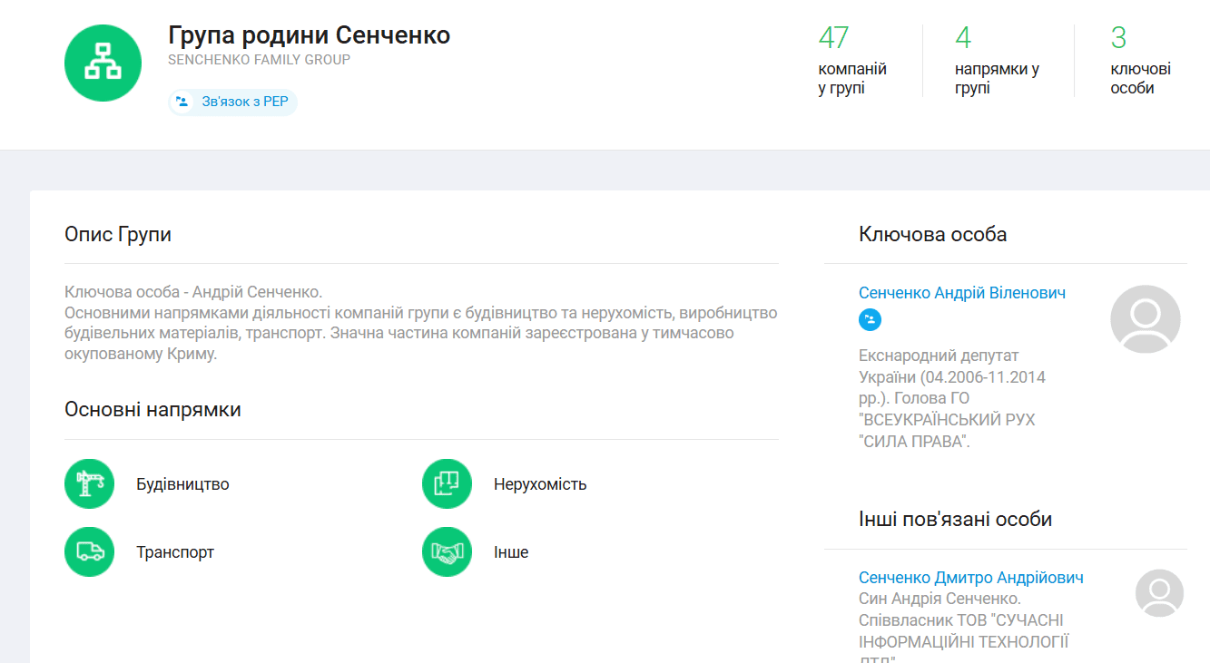 В системе Youcontrol есть данные, что ранее эта компания входила в корпоративную группу семьи Сенченко, объединяющую около пяти десятков субъектов хозяйствования, занятых в сферах строительства, недвижимости, производства строительных материалов и т.д. Ключевой фигурой этой группы является Андрей Сенченко – бизнесмен, лидер партии “Сила права”, народный депутат Украины V-VII созывов (избирался от Блока Юлии Тимошенко) и временно исполняющий обязанности заместителя главы Администрации Президента с марта по август 2014-го.