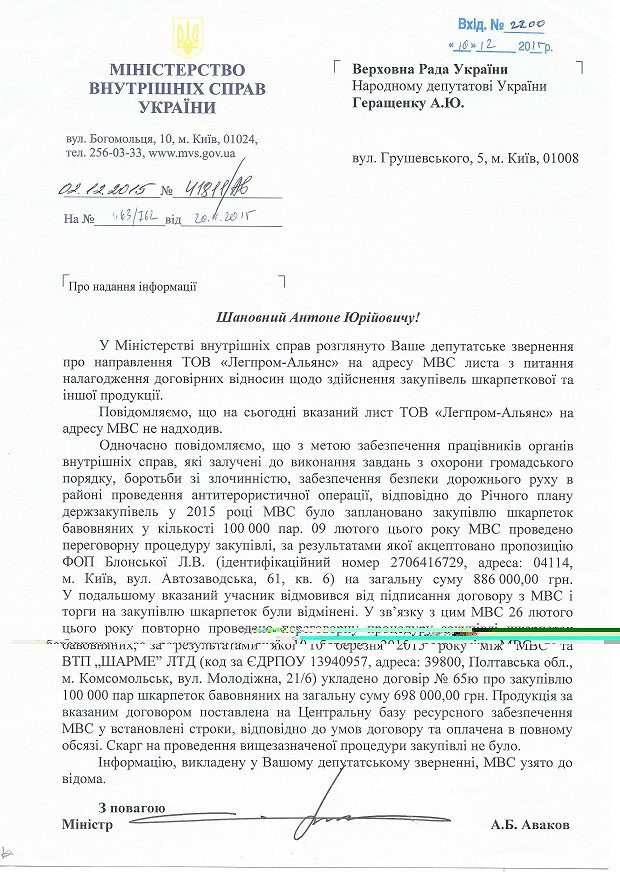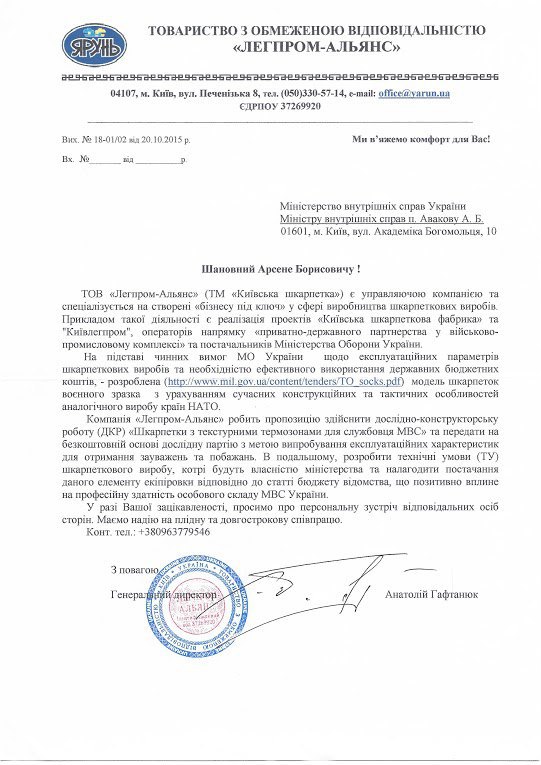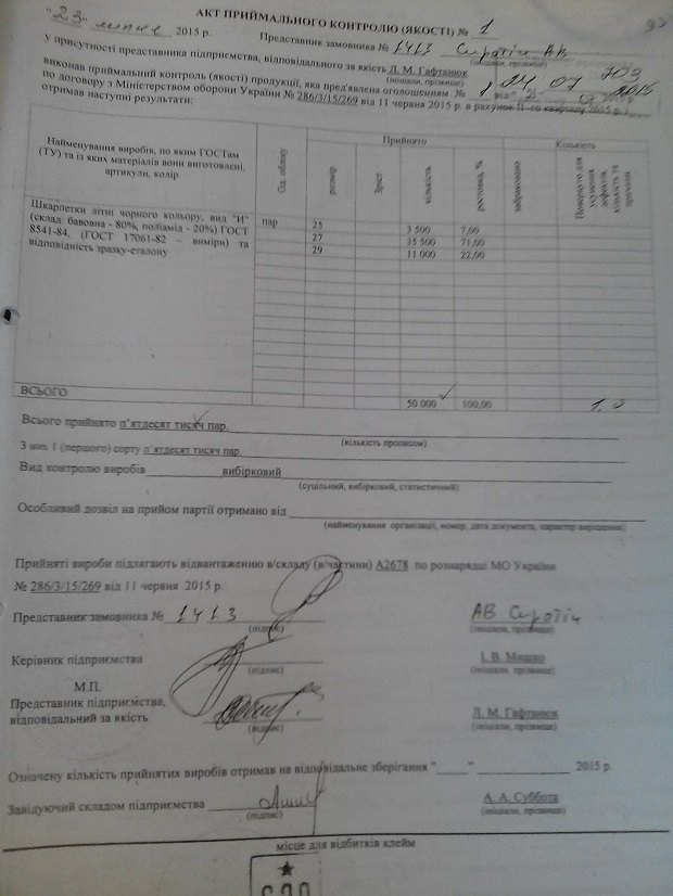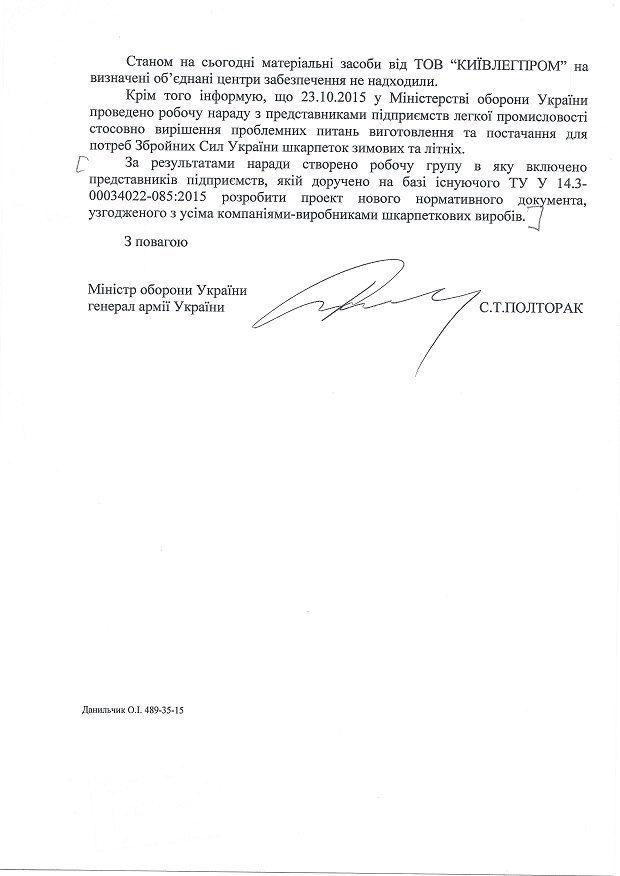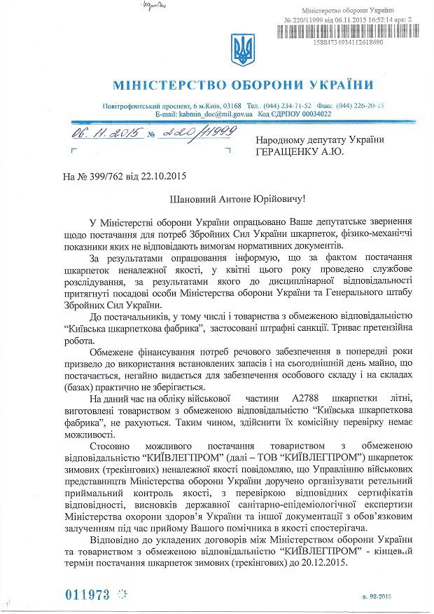 З метою перевірки зазначеної інформації – народним депутатом А.Ю. Геращенком були направлені листи до Міноборони та до виробника шкарпеток – ТОВ «Київська шкарпеткова фабрика».