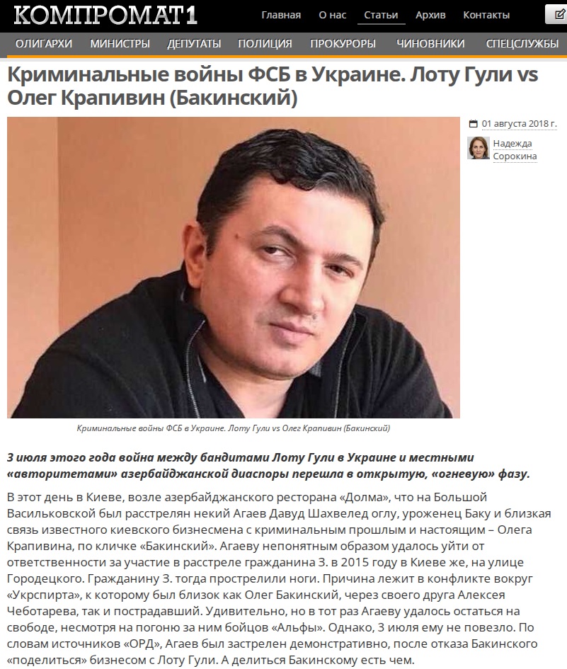 В конечном итоге дело по событиям в "Десанте" было закрыто, но летом 2022 года его восстановили через суд на фоне подготовки представления об аннулировании вида на жительство в Украине Крапивину. Аналогичным образом, в качестве негативно характеризующих материалов личности главы Конгресса азербайджанцев Киева, тогда же были использованы публикации соответствующего типа в СМИ, среди которых выделялся материал под названием "Криминальные войны ФСБ в Украине. Лоту Гули vs Олег Крапивин (Бакинский)". Последняя касается одной из интерпретаций конфликта между двумя мощными этническими группировками волелюбивых сынов Кавказа, который обострился летом 2018 года на украинских просторах.