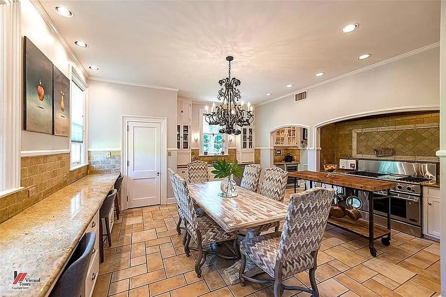 Дом имеет красивый парадный вход, семь каминов, огороженную подъездную дорогу, шесть гаражей вокруг дома и фонтан на открытом воздухе.