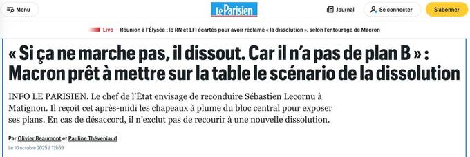 «В такой ситуации Эмманюэль Макрон готов вскрыть карты: по нашей информации, он может пойти на сценарий нового роспуска парламента. «Если это не удастся, он распустит парламент. У него нет запасного плана», — отмечает один из его близких соратников. Это станет последним элементом давления в игре президентского покера. Все или ничего... в последнюю минуту безумной недели», — сообщает издание.