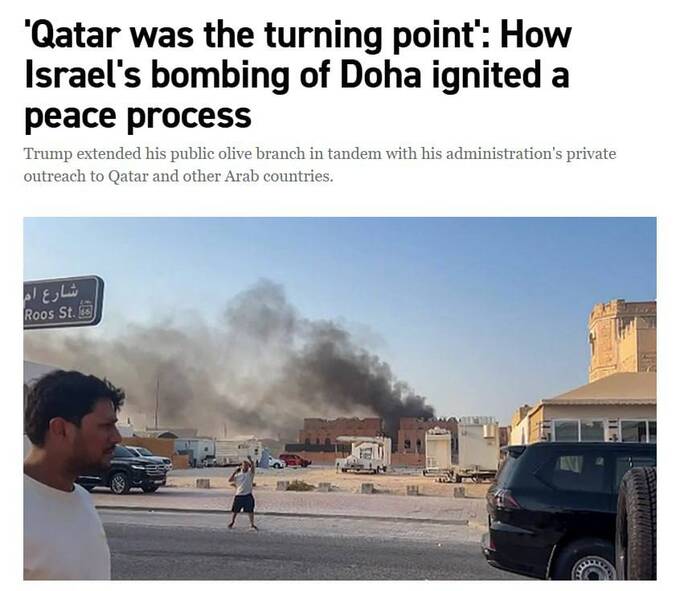 "Президент США стал гораздо более резким и прямолинейным, и после удара по Дохе необходимость мирного соглашения стала еще более насущной. Это позволило президенту оказать максимальное давление на Израиль, что он и сделал. И это действительно вынудило Израиль согласиться на мир", - рассказал изданию высокопоставленный представитель Белого дома.