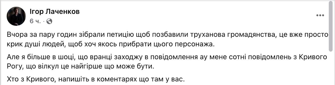 «Мне поступает множество сообщений из Кривого Рога, что Вилкул — это худшее, что могло случиться», — пишет блогер Игорь Лаченков, который считается близким к Офису президента и недавно активно раскручивал историю о лишении Труханова гражданства, а также продвигал соответствующую петицию.