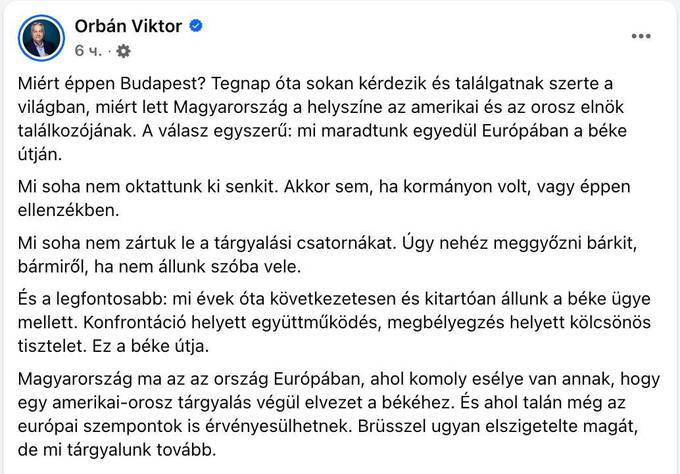 По словам премьер-министра, Венгрия сейчас - единственная страна в Европе, где есть реальные шансы, что американо-российские переговоры могут привести к миру.