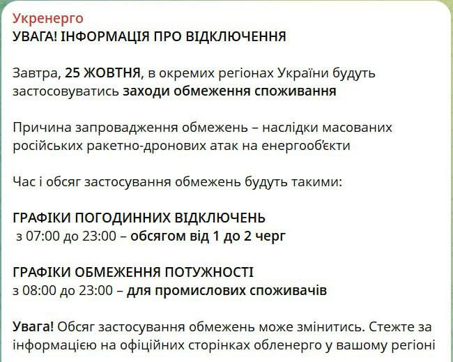 "Укрэнерго" анонсировало графики отключений на 25 октября