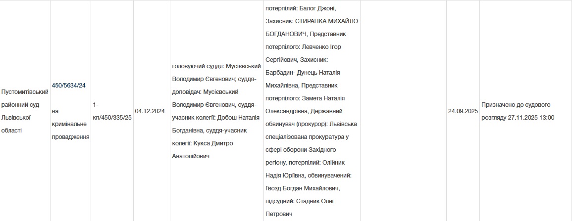 Из материалов суда следует — поиски Стадника завершились накануне празднования Нового года-2025. В последний день декабря Галицкий райсуд избрал Олегу Петровичу меру пресечения в виде ареста с залогом в размере 2 млн грн., после уплаты которого военнослужащий оказался на свободе. Рассмотрение обвинения в отношении Стадника и Гвозда по существу происходит в стенах Пустомытовского дворца Фемиды Львовщины.