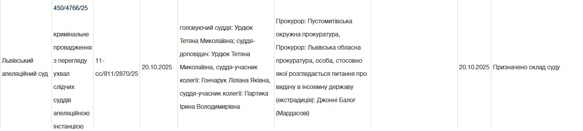 Согласно датированному 26 августа 2025 года письму с подписью заместителя начальника ГУНП во Львовской области, сотрудниками УКР было установлено, что Балог/Мардасови "находится по адресу проживания", "проходит амбулаторное лечение в коммунальном некоммерческом предприятии" и "на данный момент нуждается в наблюдении медицинских работников и посторонних лиц, в связи с ограниченными возможностями передвижения и общения с окружающими".