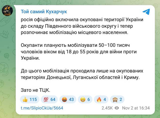 По словам Кухарчука, оккупационные войска намерены мобилизовать значительное количество мужского населения из оккупированных регионов для отправки на войну против Украины.