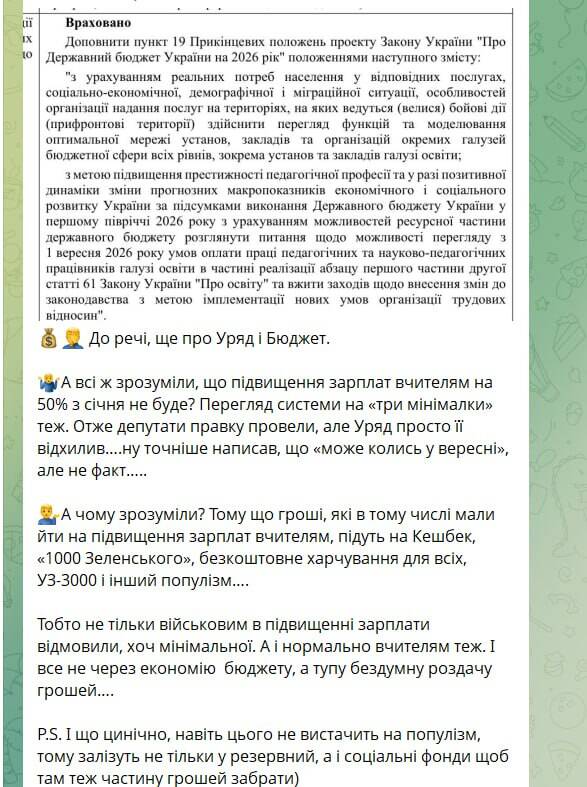 Нардеп Ярослав Железняк ранее распространил в сети сообщение о том, что повышение зарплат учителям на 50% якобы отменяется, а средства якобы перенаправят на финансирование ряда правительственных программ, таких как «Нацкешбек», «зимняя тысяча» и бесплатные 3000 км путешествий поездом.