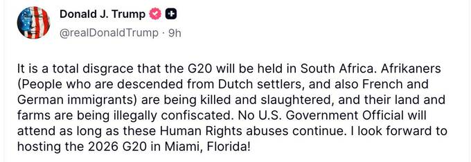 “Это абсолютный позор, что саммит G20 проводится в Южной Африке. Африканеры страдают от насилия и убийств, их земли и фермы незаконно отбираются”, — заявил президент США.
