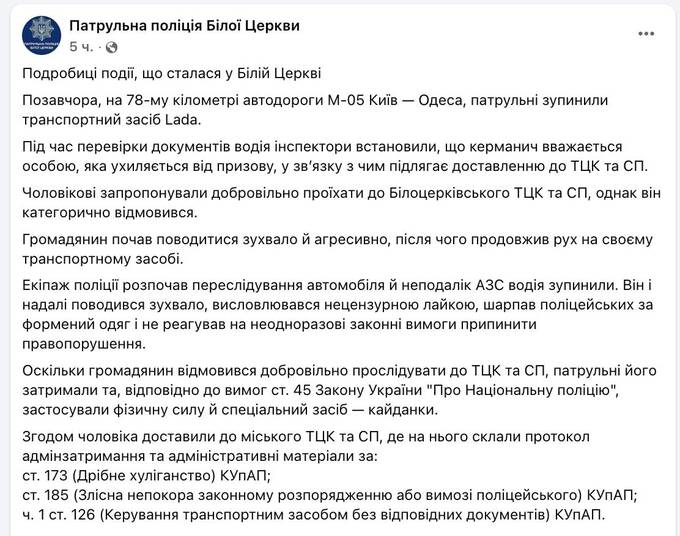 «Мужчине было предложено добровольно отправиться в Белоцерковский ТЦК и СП, но он наотрез отказался. Гражданин начал вести себя вызывающе и агрессивно, после чего продолжил движение на своём транспортном средстве. Полицейский экипаж начал преследование. Неподалеку от АЗС водителя удалось остановить. Он продолжал вести себя нагло, использовал нецензурную брань, хватал сотрудников полиции за форму и игнорировал их законные требования прекратить нарушение. Поскольку гражданин отказался добровольно проследовать в ТЦК и СП, патрульные были вынуждены его задержать», — пояснили в полиции.
