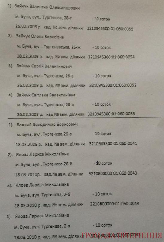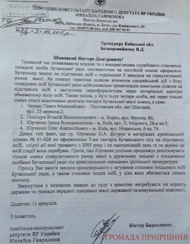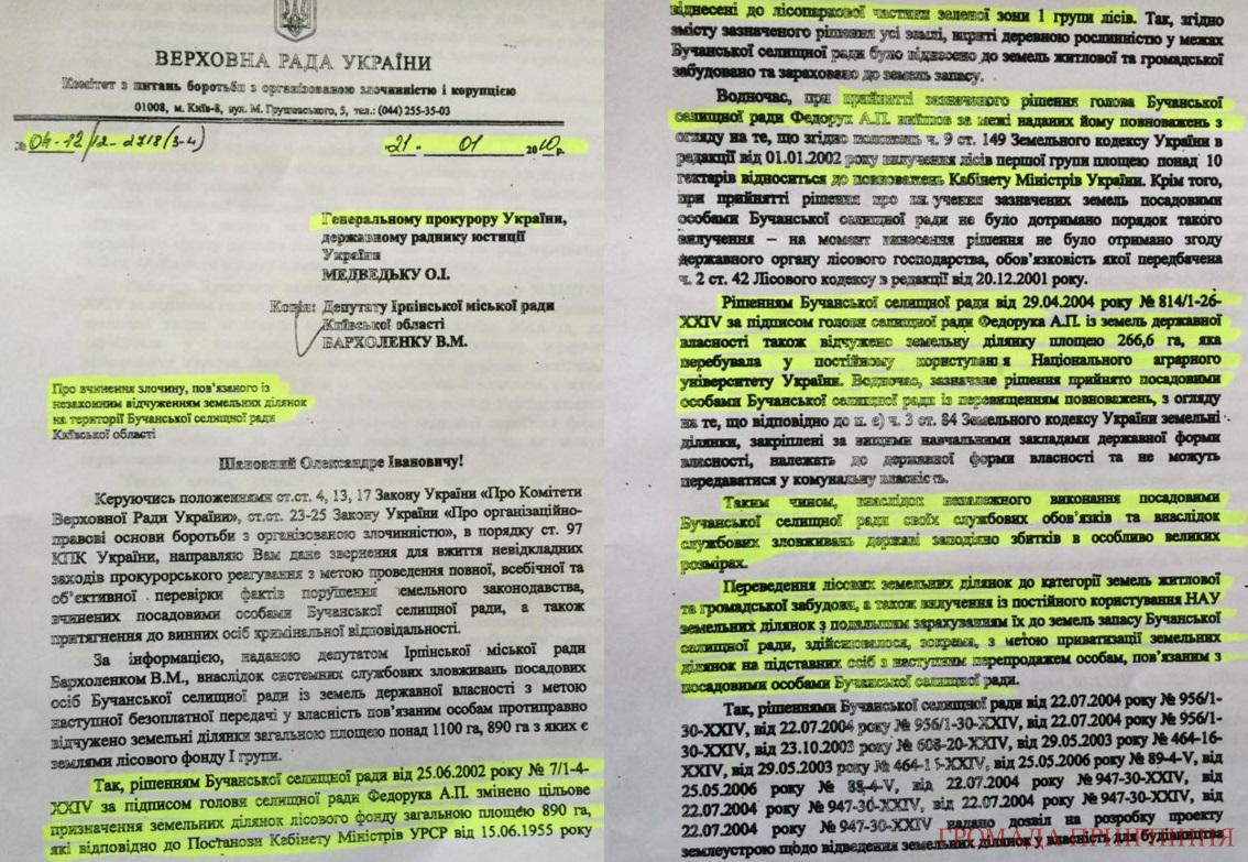 6. На моє чергове звернення до Верховної Ради України отримав чергову відписку від Апарату ВР України. Проте через деякий час 10.05.2007 р. Керівник Апарату ВРУ Валентин Зайчук звернувся з листом № 05/3-19 до Бучанського селищного голови Анатолія Федорука з проханням виділити 3.5 га для працівників Апарату. Однак, фактично земельні ділянки були оформлені особисто на Керівника ВРУ гр. Зайчука та членів його родини, а також на його заступника Володимир Яловогота членів його родини в межах земель Лісового фонду. Зокрема, Генеральною Прокуратурою України було установлено, що заяви від цих громадян на отримання земельних ділянок датовано пізніше рішень рад, прийнятих за результатами їх розгляду. Вже понад рік прокуратурою не вжито жодного заходу реагування. Дії посадових осіб ВР України Зайчука та Ялового я вважаю підпадають під ст. 364 та 368 ККУ.