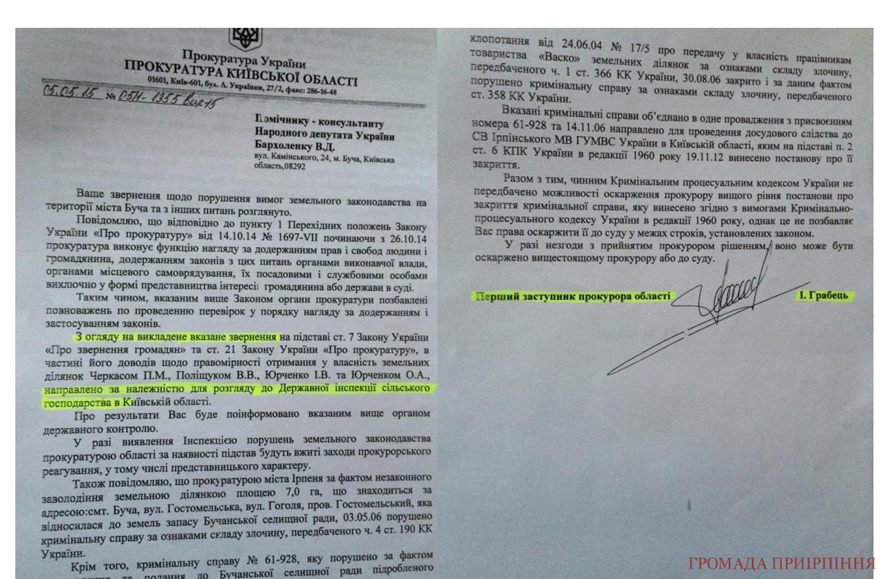 Цілком логічним є підтвердження бездіяльності Київської обласної прокуратури на моє чергове звернення за № 3/4 від 3.04.2015 р. до прокуратури Київської області, щодо оформлення через корупційні схеми понад 50 га землі у м. Бучі на 4-ьох осіб, один з яких фігурує в матеріалах кримінальної справи № 61-928 від січня м-ця 2006 року про оформлення 7-ми га Бучанського лісу на підставних осіб через фірму ТОВ “Васко”. Тобто, перший заступник прокурора Київської областіІ. Грабець своїм листом № 05/1-1355 від 05.05.2015 р., з невідомих обставин, чомусь, не вбачає ознак корупційної діяльності при оформленні великих площ землі на підставний осіб. Зокрема, заздалегідь знаючи, що це питання є виключною компетенцією прокуратури, він направив цей матеріал до Державної інспекції сільського господарства Київської області з метою «поховати» цю справу та не дати їй ходу. Тому я вважаю, що прокурор Грабець вчинив злочин який підпадає під ст. 367 ККУ.