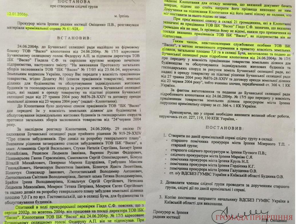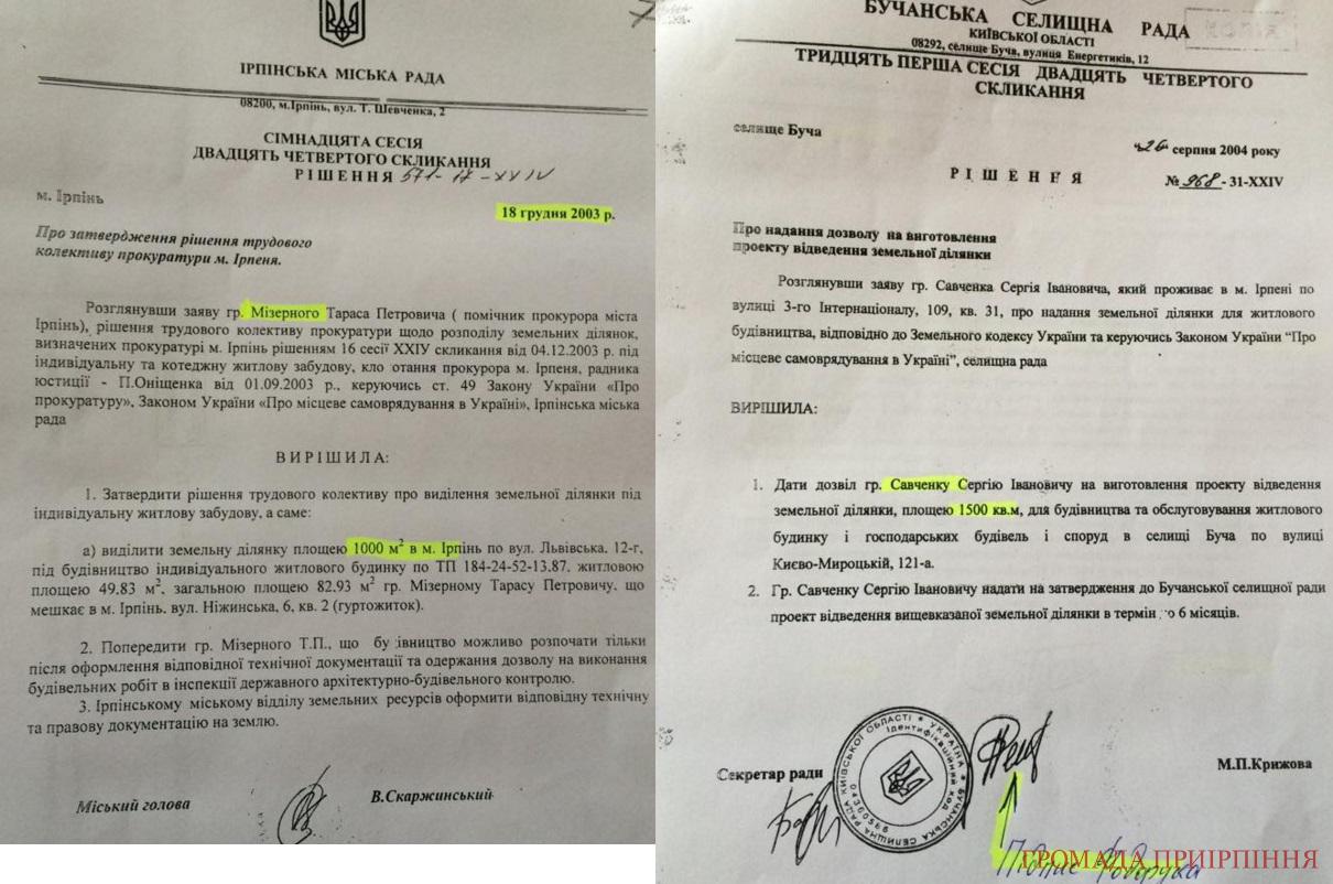 - 06.2002 року Бучанська селищна рада своїм рішенням № 71/1-4-ХХІV незаконно перевела землі Державного лісового фонду до категорії земель громадської та житлової забудови. Таким чином місцева влада в особі Бучанського голови Анатолія Федорука цинічно кинула890 га Бучанського лісу під сокиру. Я вважаю, посадові особи Бучанської ради прийнявши це рішення скоїли злочин, який підпадає під ст. 191, 364 та 368 ККУ. Після масових протестів місцевого населення проти знищення Лісового фонду та чисельних звернень громадян до правоохоронних органів прокуратурою м. Ірпеня лише через 2 роки 18.05.2004 р. було подано в інтересах держави заяву до суду за № 1945-15 про скасування рішення Бучанської ради. Однак, прокуратура не надала необхідні докази, а заява була сформульована таким чином, аби свідомо програти інтереси держави в суді на користь корупції. І в цьому немає нічого дивного так як прокурор Ірпеня Павло Оніщенко, заступник прокурора Тарас Мізерний, який в суді представляв інтереси держави і навіть суддя Сергій Савченко мали власні інтереси в межах земель, які були предметом спору в суді. Окрему увагу потрібно звернути на суддю Савченка, та прокурора Мізерного, які звернулися із заявами до Бучанського голови Анатолія Федорука на отримання для себе земельних ділянок саме в той час, коли дана судова справа перебувала в провадженні судді Савченка. Більше того, прокурор Мізерний попередньо отримав земельну ділянку в межах земель Лісового фонду м. Ірпеня у 2003 році, тобто, з використанням службового становища двічі використав своє право на безкоштовне отримання та приватизацію земельної ділянки. А тому, цілком логічно, що Ірпінський міський суд 26.10.2004 р. по справі № 2-1961/2004 прийняв рішення на користь корупції. Можна стверджувати, якби рішення суду було прийняте в інтересах держави то їхні земельні ділянки опинилися б поза Законом. Таким чином, прокурори Павло Оніщенко, Тарас Мізерний та суддя Сергій Савченко скоїли злочини, які підпадають під ст. 364, 368, 368 ККУ. Але це все дрібниці в порівнянні з тими корупційними схемами дерибану землі, які мали місце в продовж тривалого часу.