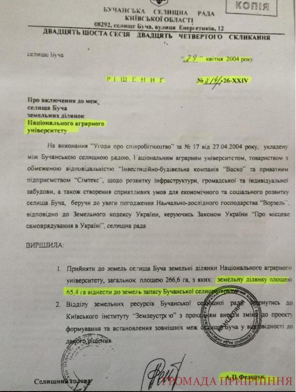 Також, Комітет підтвердив, що рішенням Бучанської ради від 2004 року за підписом голови ради Федорука із земель державної власності було відчужено земельну ділянку площею в десятки гектарів, яка перебувала у постійному користуванні Національного аграрного університету України. Водночас, зазначене рішення прийнято посадовими особами Бучанської ради із перевищенням повноважень так як вилучення земель державної власності повинно відбуватися виключно за Постановою КМУ.