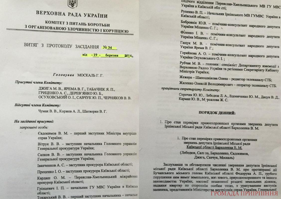 10. Тільки після революції Гідності всі ці матеріали були предметом розгляду на засіданні Комітету Верховної Ради України по боротьбі з організованою злочинністю та корупцією. Члени Комітету ознайомившись із матеріалами справи та заслухавши мою доповідь прийняли протокольне рішення № 34 від 19.03.2014 р. та зобов’язали правоохоронні органи на протязі двох місяців вжити заходи відповідного реагування. Лише після рішення Комітету прокуратура Київської області подала дві позовні заяви до суду щодо визнання не дійсними рішення Бучанської ради № 71/1-4-ХХІV від 25.06.2002 р. про незаконне вилучення земель Лісового фонду та незаконне вилучення земель державної власності, які перебували в постійному користуванні НАУ до земель запасу Бучанської ради та витребувати на користь держави в особі КМУ з незаконного володіння “Бучанського Межигір’я” № 1 пл. 14 га в межах земель Лісового фонду та “Бучанського Межигір’я № 2″ пл. 12 га в межах земель НАУ власником яких де-юре являється рідний дідусь Ігоря Калєтніка Василь Кірган, а де-факто сам Ігор Калєтнік.