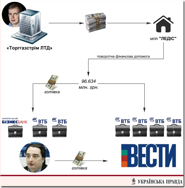 За даними слідства, ці 96,6 млн гривень надходили на рахунки "Ледіс" протягом восьми місяців (березень-листопад 2013 року) у вигляді зворотно-безвідсоткової фінансової допомоги від компанії "Торггазстрім ЛТД".