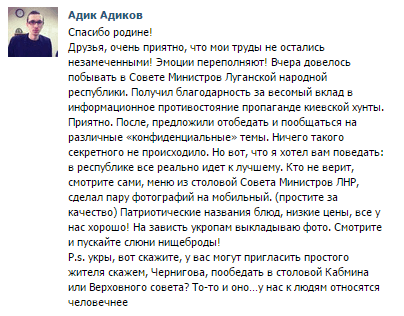 "После, предложили отобедать и пообщаться на различные "конфиденциальные" темы. Ничего такого секретного не происходило. Но вот, что я хотел вам поведать: в республике все реально идет к лучшему. Кто не верит, смотрите сами, меню из столовой Совета Министров ЛНР, сделал пару фотографий на мобильный. (простите за качество) Патриотические названия блюд, низкие цены, все у нас хорошо! На зависть укропам выкладываю фото. Смотрите и пускайте слюни нищеброды!" – похвастался Адиков, которого пустили поесть в столовую для верхушки "ЛНР".