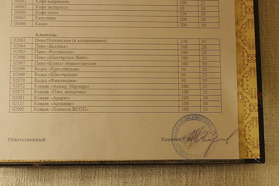 Согласно иллюстрации, 100 г коньяка Hennessy VSOP обойдется в столовой всего лишь в 55 рублей (около 16,4 грн – Ред.). Эскалоп с брусничным соусом стоит 58,5 рублей за 280 г (около 17,5 грн – Ред.).