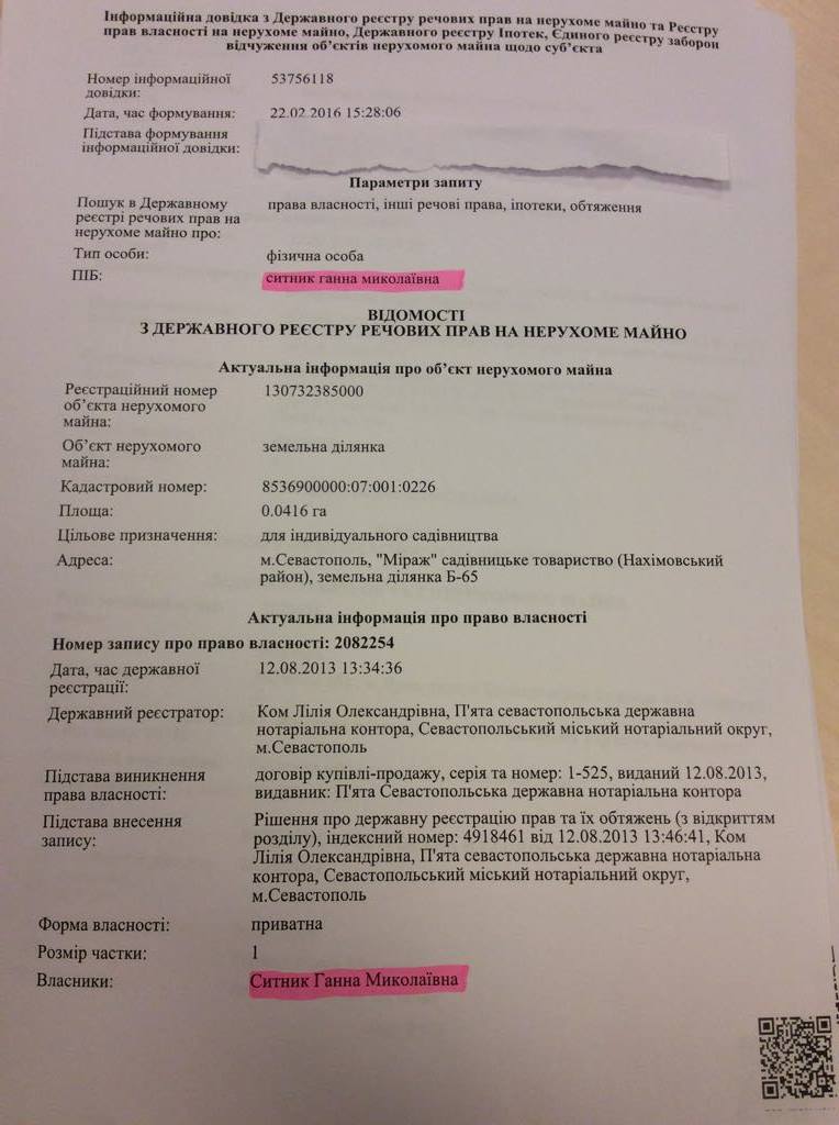 А вот у его супруги есть участок в 4 сотки. Выписка из госреестра прав на недвижимость свидетельствует, что земля Анны Сытник находится вблизи Севастополя, в садовом кооперативе "Мираж" - более известном как курорт Орловка. Семейство купило эту территорию под застройку в 2013 году и планировало возвести там трехэтажный мини-отель, даже разработали проект. Однако, на прошлой неделе приняли решение о срочной продаже.