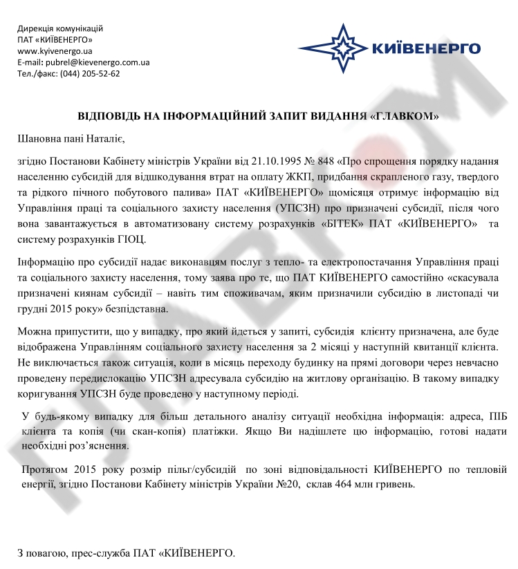 Коли матеріал був готовий до друку, «Київенерго» надало відповідь «Главкому». Компанія-монополіст переадресовує проблему соціальним службам, які нібито не надають їм вчасно інформацію про призначення субсидій.