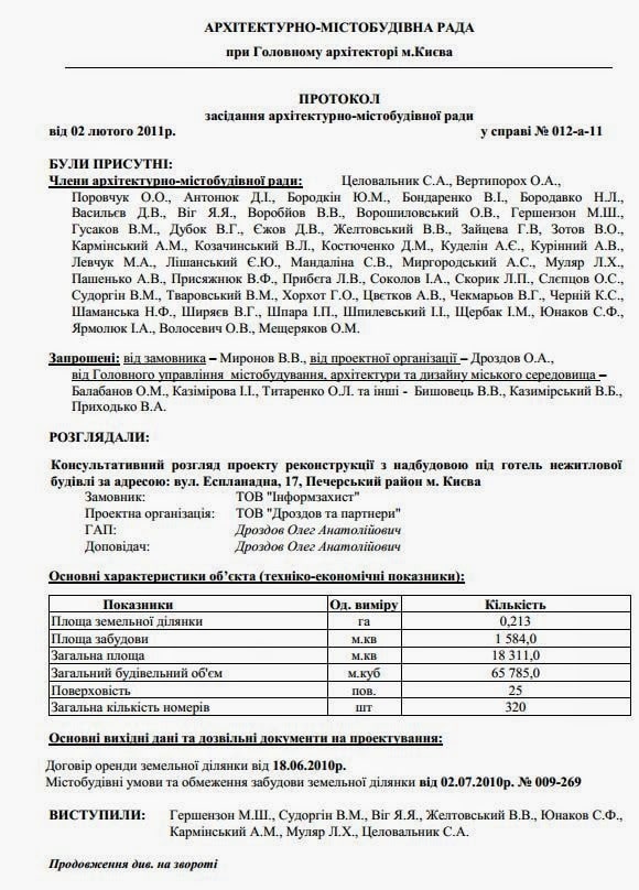 Но на этом схема отжатия государственной собственности еще не могла считаться реализованной в полной мере. Рассмотреть и утвердить проект реконструкции и надстройки должен был Архитектурно-градостроительный совет города Киева, заседание которого состоялось 2 февраля 2011 года под председательством главного архитектора столицы Целовальника С.А.