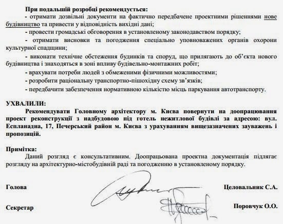 Архитектурный градсовет, как видно из нижеприведенного документа, не сразу пошел навстречу "Семье" и Андрею Кравцу. Но в целом одобрил строительство гостиницы, обратив внимание на недочеты, которые рекомендовал устранить. Этот документ вызывает некий когнитивный диссонанс. С одной стороны, градсовет решил: "Рекомендовать главному архитектору вернуть на доработку проект реконструкции с надстройкой под гостиницу". А с другой, - рекомендовал "Информзахысту" "получить разрешительные документы на фактически предусмотренное проектными решениями новое строительство". Вообще же рекомендации городских архитекторов были очень правильными. Но, тем не менее, эта инстанция была пройдена, а некоторые рекомендации так и остались рекомендациями "консультативного характера".