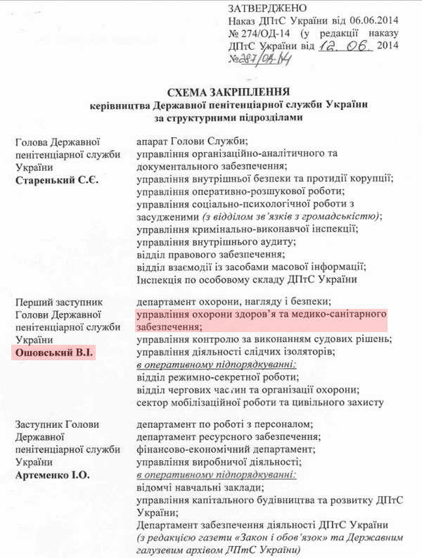 А тепер – найцікавіше. За розподілом обов’язків, саме незвільнений Ошовський відповідав у пенітенціарній системі України за "управління охорони здоров’я та медико-санітарного забезпечення".