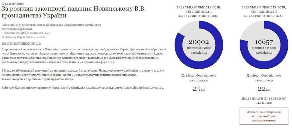 Добавим, что это уже вторая электронная петиция, в которой люди требовали разобраться с гражданством депутата Оппозиционного блока Новинского. Первое обращение украинцев к Президенту: «О лишении народного депутата от оппозиционного блока Новинского В.В. гражданства, подаренного ему Януковичем в 2012 году за «особые заслуги» набрало более 20 тысяч голосов. Но за 30 дней до окончания голосования Петиция неожиданно исчезла с сайта Президента.
