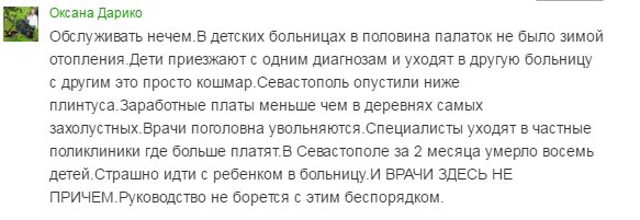 9. Крымчане про медицину и жизнь: "Севастополь опустили ниже плинтуса. Заработные платы меньше, чем в самых захолустных деревнях. Врачи поголовно увольняются".