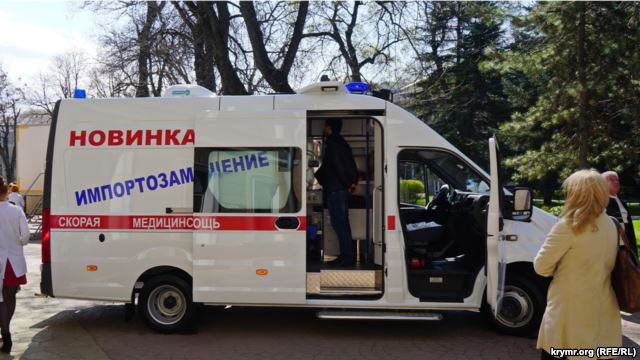 12. Крымчане всё чаще жалуются на медобслуживание. Поэтому оккупанты решили кинуть кость голодным, устроив выставку из нескольких медицинских автомобилей с громкой надписью – ИМПОРТОЗАМЕЩЕНИЕ!