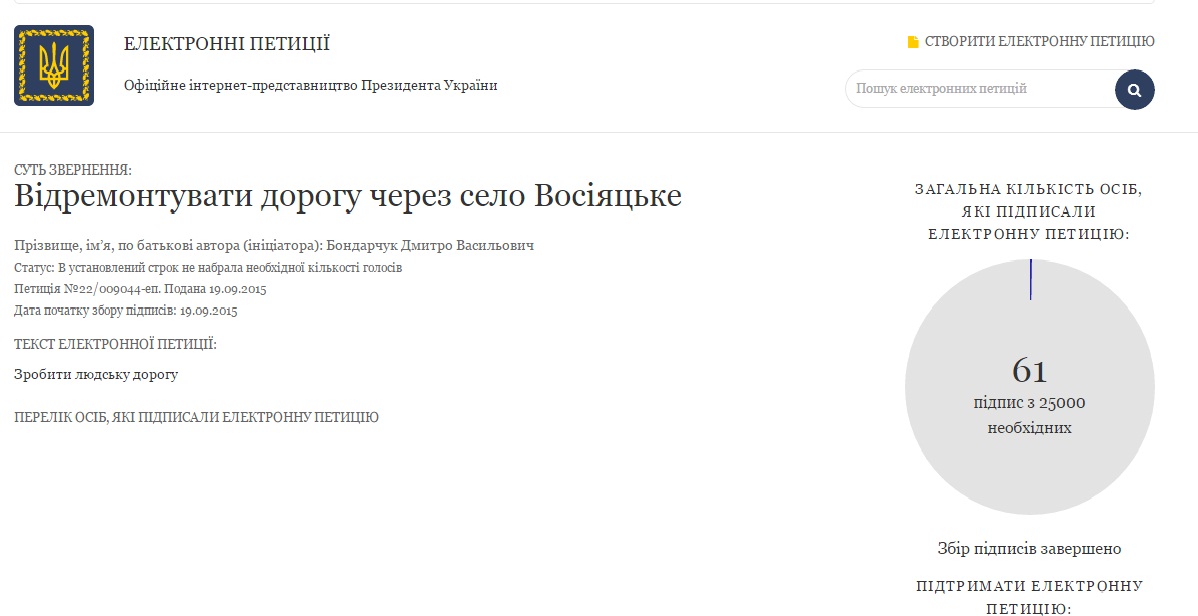 До слова, водії настільки обурилися бездіяльності влади щодо жахливого стану дороги поблизу села Восіяцьке, що створили електронну петицію на сайті Президента. Щоправда, звернення не набрало необхідної кількості голосів для розгляду.