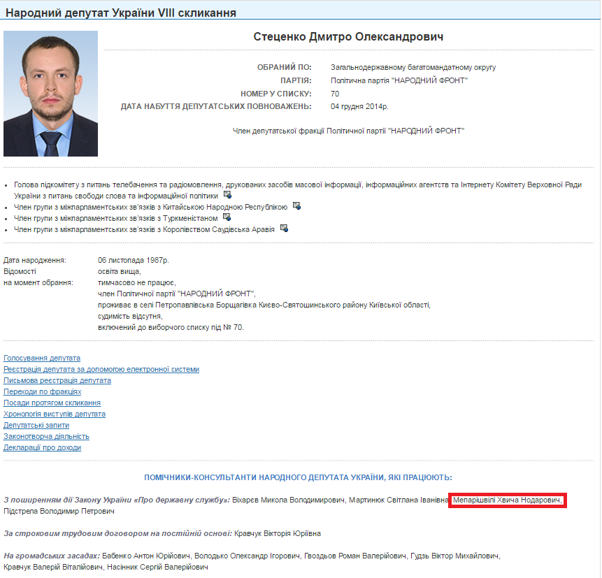 Примечательно, что, несмотря на столь недлительный срок работы, Мепаришвили был помощником нардепа не на общественных началах, а согласно действию закона о госслужбе, а сам Стеценко на момент избрания депутатом был временно безработным.