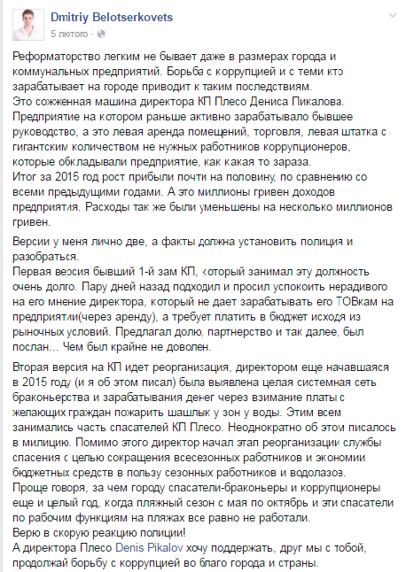 «Сожженная машина директора КП «Плесо» Дениса Пикалова. Предприятие, на котором раньше активно зарабатывало бывшее руководство. Итог за 2015 год – рост прибыли почти в половину, по сравнению со всеми предыдущими годами», – рассказывал на то время директор столичного Департамента благоустройства и сохранения природной среды, а сегодня – народный депутат Дмитрий Белоцерковец.